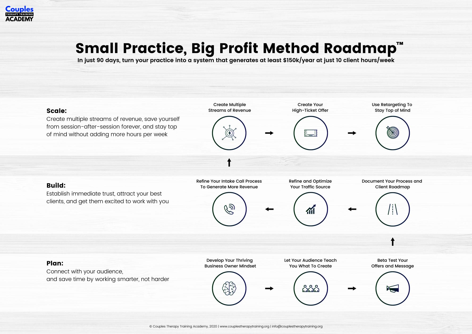 Confidentiality/Responsibility: We will keep any information you provide us about your practice strictly confidential. Likewise, we require that, within the Program, any information we provide you with that we designate as confidential, you must treat it as such. We will provide you specific and valuable information, guidance, roadmap, templates, ideas on how to maintain and grow your practice/business/company. Please note that your business decisions as the sole proprietor, entrepreneur, owner, director or lead of your own practice/company are your own. CTTA, the Advanced Couples Therapy Mastermind Program – which includes the Small Practice Big Profit and Advanced Gottman Clinical Track – do not hold any responsiblity for the decisions you make in your practice/business/company.